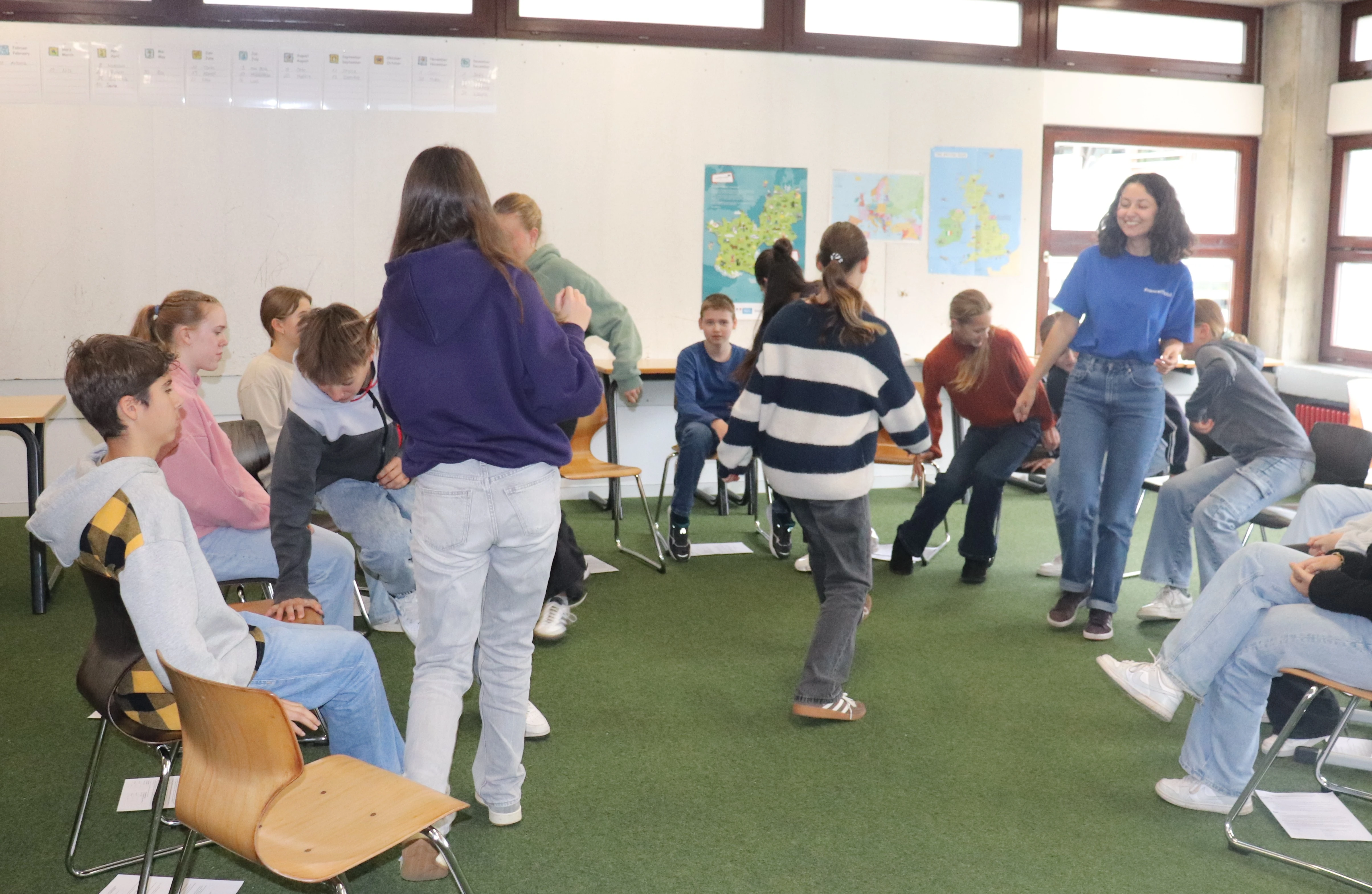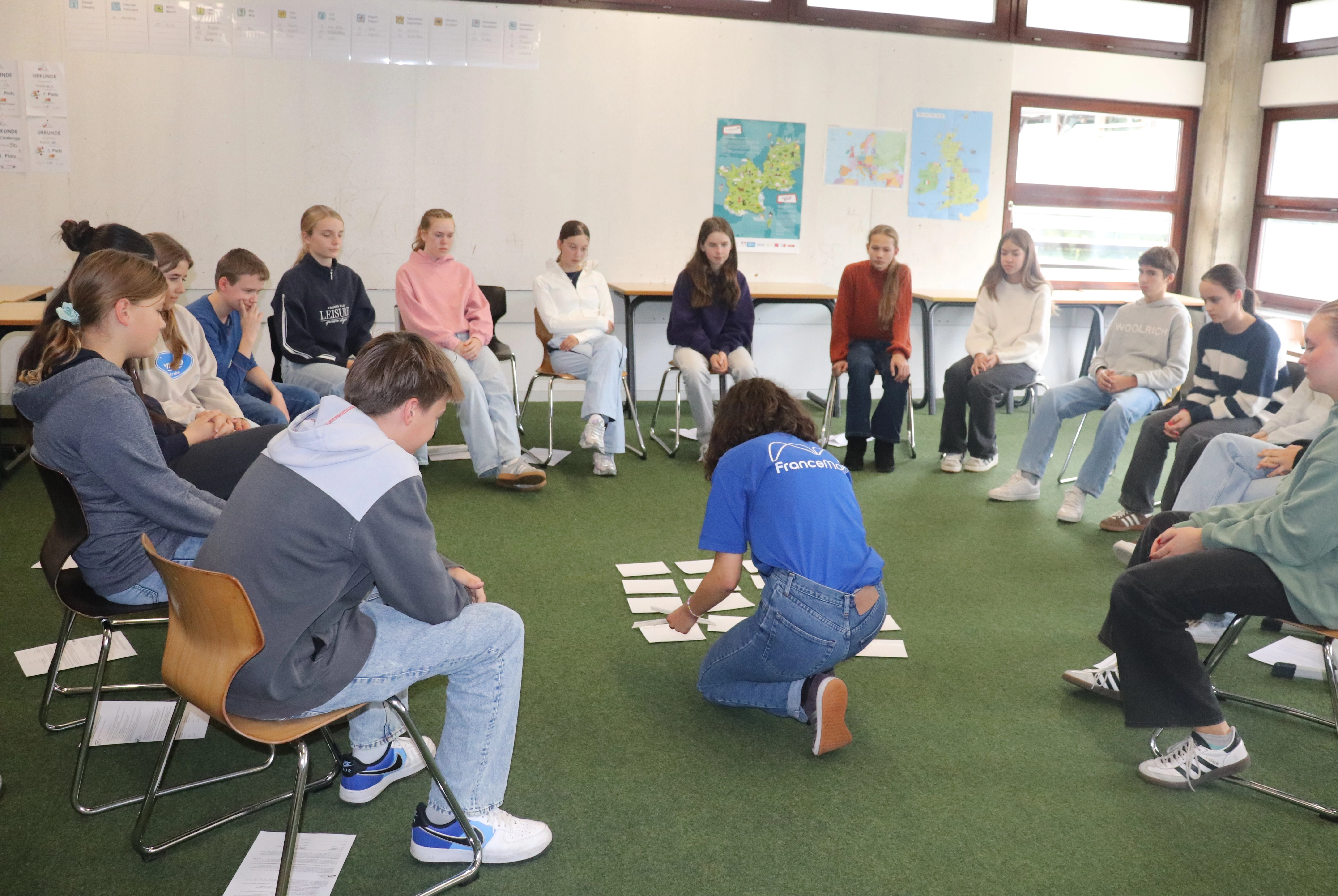 Die 23-jährige Mme Nievollet vom France Mobil, aufgewachsen in Grenoble, gestaltete einen abwechslungsreichen Vormittag für die Klassen 7–10. In jeweils einer Unterrichtsstunde brachte sie den Schülerinnen und Schülern mit spielerischen Aktivitäten die französische Sprache näher.