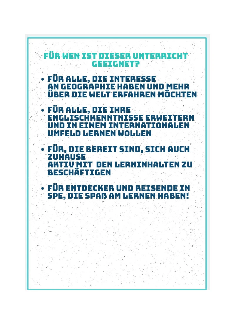 Ziel ist es, sowohl die fachlichen Kompetenzen im Bereich Geographie als auch die Sprachkompetenz im Englischen zu stärken. Die Jugendlichen erweitern ihren Wortschatz, trainieren das fachbezogene Sprechen und gewinnen Sicherheit im Umgang mit englischsprachigen Materialien – eine wertvolle Vorbereitung auf weiterführende Bildungswege und eine zunehmend international geprägte Lebens- und Arbeitswelt.